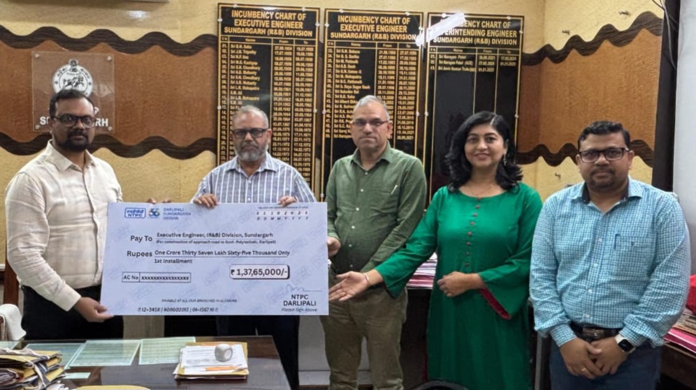 Better Roads, Better Access and strengthening infrastructure in neighbouring communities is our first priority, The project is being executed through the Roads & Building Department, Sundargarh, on a deposit basis with a total cost of ₹2,75,30,000.The first instalment of ₹1,37,65,000 (50% of project cost) was handed over to the Superintending Engineer, Roads & Building Department, Sundargarh Division, on 31 October 2025. The amount was formally presented by Shri Faiz Taiyab, Head of Project, NTPC Darlipali, in the presence of Shri Ravindra Sharma, General Manager (O&M), and Ms Pratibha Singh, Head of HR, NTPC Darlipali.