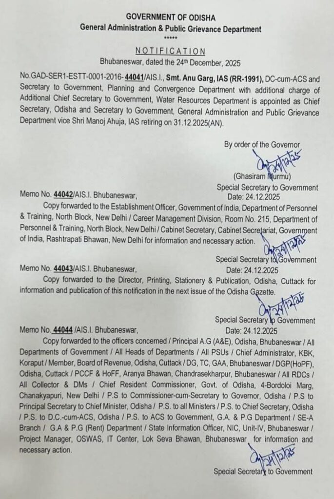 ଭୁବନେଶ୍ୱର: 24.12.2025 (ଆ.ଦୁ.ନି) ବରିଷ୍ଠ IAS ଅଧିକାରୀ ଅନୁ ଗର୍ଗଙ୍କୁ ଓଡ଼ିଶାର ନୂତନ ମୁଖ୍ୟ ସଚିବ ଭାବରେ ନିଯୁକ୍ତ କରାଯାଇଛି, ସେ କେନ୍ଦ୍ର ସରକାରଙ୍କ ଅଧୀନରେ କାର୍ଯ୍ୟରତ ଆଇଏଏସ୍ ମନୋଜ ଆହୁଜାଙ୍କ ସ୍ଥାନରେ ନିଯୁକ୍ତି ପାଇଛନ୍ତି, ଯିଏ ଡିସେମ୍ବର 31, 2025 ରେ ଅବସର ନେଉଛନ୍ତି।