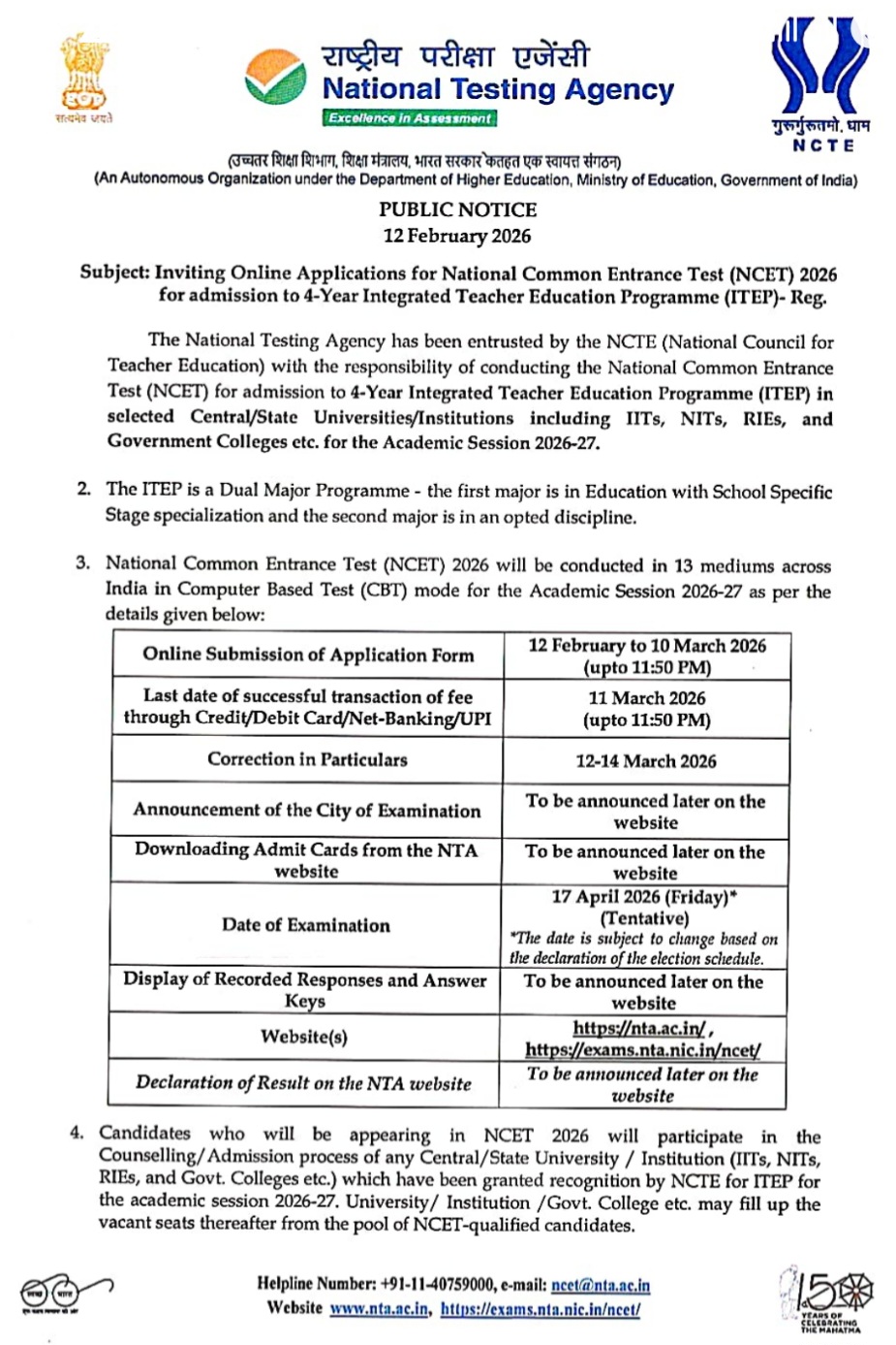 Tomorrow (10th March, 2026) is the last date to apply for the National Common Entrance Test-2026 (NCET). Students can submit their applications for the examination through the website of the National Testing Agency until 11:50 PM tomorrow.